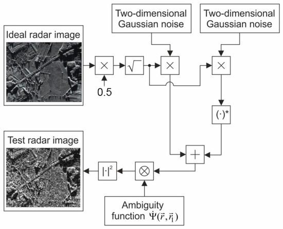 The diagram presented in Figure 3 includes the following components: the ideal radar image, representing a pre-stored “ideal” high-resolution radar image; two-dimensional Gaussian noise units, used to produce spatially discrete Gaussian noise with unit variance; operation blocks, labeled, such as +, ×, √, (∙)* and |∙|2, which correspondingly represent a symbol of the addition, the product, the square root operation, the complex conjugation and the modulus square calculation operations; the ambiguity function , which is a previously generated two-dimensional ambiguity function, and the test radar image being the resulting test radar image of the simulation modeling.