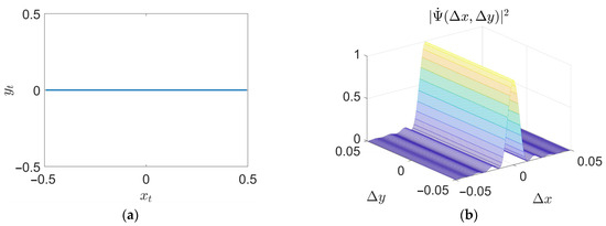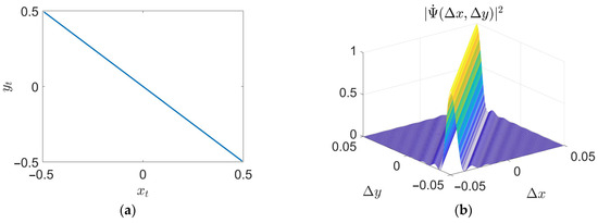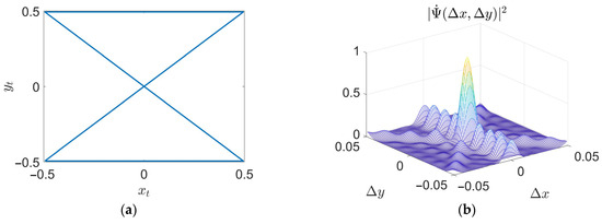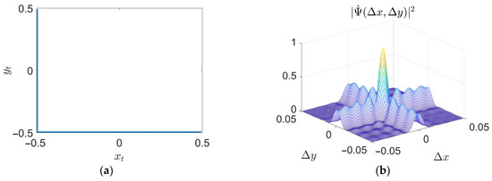 According to Equation (25), once the optimal output effect in Equation (36) has been formed, the computation of its squared modulus is required. Since the squared modulus of equals one, this step can be omitted in the formation of . In general, the spatial coordinate processing involves performing operations akin to the general inverse spatial Fresnel transform. Through these optimal processing steps, the aperture of the radio system’s antenna array is synthesized to the dimensions of the scanning area . The synthesis quality is impacted by the trajectory of the radio sensor along the spatial coordinates . The spatial resolution of radar for surface radio imaging using the static-aperture synthesis technique will be analyzed by defining the ambiguity function and demonstrated through results from simulation modeling.