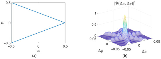 is the ambiguity function of the radar imaging system, where is the spatial distribution of the normalized radar cross-section, characterizing the system’s response to a point radiation source. The ambiguity function in Equation (28) defines the radar system’s angular resolution capabilities, which are critical for generating radar images of the surface using static-aperture synthesis technology.