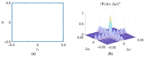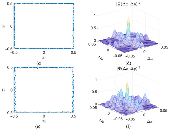 It is advisable to study cases when the motion trajectory is not ideal, as this is always the case in practice, because each positioning system has its own spatial coordinate change step and displacement. To investigate this effect, we selected the square trajectory, which was found to be the best for ideal movement, and added some variation to this geometry. The resulting trajectories with 2.5 mm, 5 mm, and 7.5 mm variations are shown in Figure 15a,c,e, respectively. For each of these trajectories, ambiguity functions were obtained for the cases of observing a point source (Figure 15b,d,f, respectively).