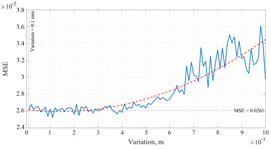 Since trajectory variations deteriorate the quality of the obtained image, the limiting factors of the variations were investigated by computing the MSE for variations from 0.1 mm to 10 mm, averaging 500 estimations for each variation value employed. Figure 17 shows the dependence of the MSE on the value of the variation of the radio scanner trajectory for moving in a square shape.