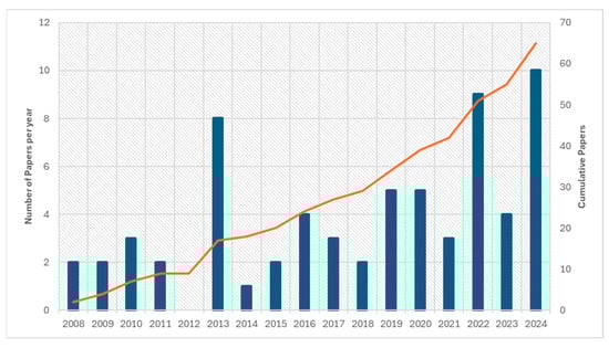 - Material collection: To gather relevant publications related to TAS models and algorithms in ports and container terminals, an extensive search was conducted across digital resources, including databases and publishers such as Google Scholar, ScienceDirect, Emerald, Inderscience, Springer, Hindawi, and Taylor & Francis. The search utilized keywords such as truck appointment systems, truck appointment scheduling, gate appointment system, truck scheduling, vehicle booking systems, and time slot assignment. To enhance the reliability of the review process, the full text of each paper was screened and included in this review only if it met the following criteria: (i) papers published in 2008–2024; (ii) papers written in English; (iii) exclusive focus on TASs in ports and container terminals; (iv) papers including a mathematical models for TASs; and (v) exclusion of “grey” literature items, such as textbooks, conference papers, monographs, doctoral dissertations, and book chapters.