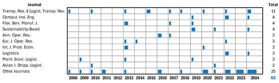 The reviewed literature indicates that most contributions are journal articles spanning various fields, including transportation, operation research and management science, engineering, environmental studies, decision science, and computer science. The journals with the highest volume of TAS-related works include Transportation Research Part E, Computers and Industrial Engineering, Flexible Services and Manufacturing Journal, Sustainability, Annals of Operations Research, European Journal of Operational Research, International Journal of Production Economics, Logistics, Maritime Economics and Logistics, and The Asian Journal of Shipping and Logistics.