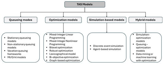 Optimization models in TAS can be classified into exact and metaheuristic approaches. Exact methods include techniques such as the Frank–Wolfe method and branch-and-price heuristics. Metaheuristic algorithms encompass Genetic Algorithms (GAs), hybrid GA-Simulated Annealing, Tabu Search (TS), Variable Neighborhood Search (VNS), improved VNS (IVNS), and Hybrid GA-VNS combinations. Robust and stochastic optimization models are tackled using two-stage robust optimization with column-and-row generation algorithms or stochastic assignment heuristics integrated with discrete choice modeling. Simulation-based optimization approaches embed simulation within heuristic methods or combine discrete-event simulation with optimization algorithms like GA. Furthermore, agent-based models employ auction-based mechanisms for decentralized scheduling or simulate collaborative systems to evaluate interactions and performance.