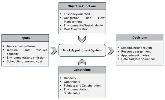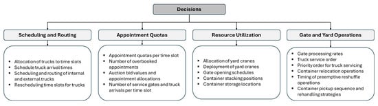 The decision variables for scheduling truck appointments can be categorized into four primary groups (see Figure 5): (i) scheduling and routing, (ii) appointment quotas, (iii) resource utilization, and (iv) gate and yard operations.