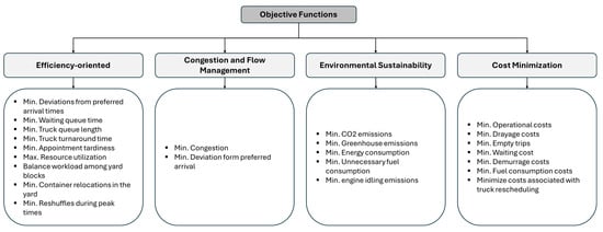 The objective functions for scheduling truck appointments can be categorized into four main groups (see Figure 6): (i) efficiency-oriented objectives, (ii) congestion and flow management objectives, (iii) environmental sustainability objectives, and (iv) cost minimization objectives.