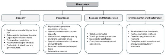 The constraints for scheduling truck appointments can be categorized into four primary groups: (i) capacity constraints, (ii) operational constraints, (iii) fairness and collaboration constraints, and (iv) environmental and sustainability objectives (see Figure 7).