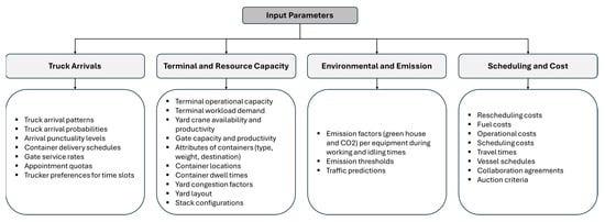 The input parameters for scheduling truck appointments can be classified into four main categories: (i) truck arrival parameters, (ii) terminal and resource capacity parameters, (iii) environmental and emission parameters, and (iv) scheduling, time and cost parameters (see Figure 8).