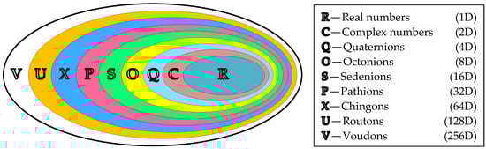 For n = 0, we obtain the real numbers (ℝ—Real), which are one-dimensional (1D) since 20 = 1. For n = 1, 21 = 2, the two-dimensional (2D) complex numbers (ℂ—Complex) are derived. For consistent terminology, 1D numbers have also been called unarions, and 2D numbers, binarions []. For n = 2, 22 = 4—the numbers of dimension four (4D), quaternions (ℚ—Quaternions), are obtained, and for n = 3, 23 = 8—the eight-dimensional (8D) octonions (𝕆—Octonions) are obtained. These are followed by the 16D sedenions (𝕊—Sedenions), 32D pathions (ℙ—Pathions), 64D chingons (𝕏—Chingons), 128D routons (𝕌—Routons), and 256D voudons (𝕍—Voudons). All number systems with a dimension higher than two are collectively called hypercomplex numbers.