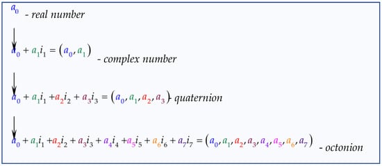 Octonions are representable by real numbers (Figure 2) and have a double dimension compared to quaternions, i.e., they appear as their logical extension. If a0, a1, a2, a3, a4, a5, a6, and a7 are real coefficients, and {i1, i2, …, i7} are imaginary units whose squares are equal to −1, the octonion can be represented as follows: