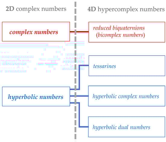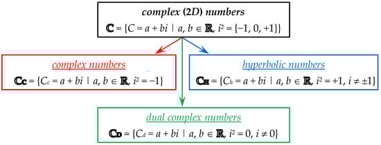 In an ordered pair (30), the complex numbers can be of any of the three types of complex numbers defined in Section 2.1 (Figure 3), namely, the classical complex numbers ℂℂ, the hyperbolic numbers ℂℍ, and the dual complex numbers ℂ𝔻. Tessarines, for example, are hyperbolic numbers with complex coefficients. They, together with bicomplex numbers, are still of interest today [,,,]. It was only at the end of the 20th century that dual numbers with complex coefficients (complex dual numbers) were proposed [], which, however, have noncommutative multiplication.