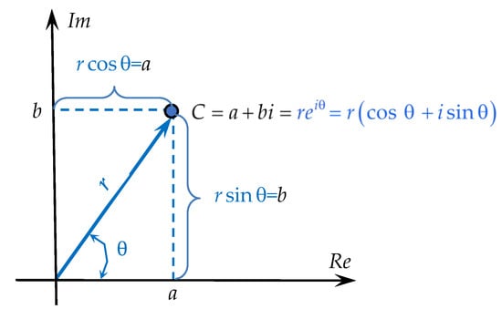 The complex number C (Figure 4) can be represented in arithmetic form by its real and imaginary parts, as an ordered pair of real numbers, in exponential form, or in trigonometric form after the Euler transformation is used, [,]: