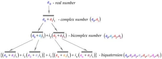As can be seen from Figure 2, the numbers of the different numerical systems can also be represented as ordered sequences of real numbers (a0, a1, a2, …., an). To denote the numbers of the numerical systems with a higher dimension than the one-dimensional real numbers, capital Latin letters with or without a numerical subscript will be used, namely, for complex numbers—C, for quaternions—Q, for biquaternions—BQ, and for bicomplex numbers—BC.