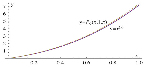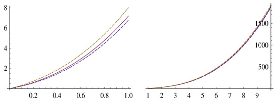 The inequalities in (29) are illustrated in Figure 2, where the dashed line represents the graph of the function and the continuous line, compressed between the nearly coinciding graphs of the functions , represents the graph of the function .