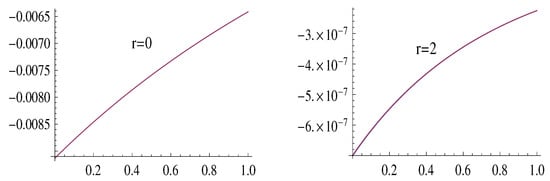 The inequalities (32) can be used to estimate the error by using the appropriate , which specifies a negligibly small (see (23)) and, thus, provides a useful estimate for . Figure 3 and Figure 4 illustrate the estimate (32), for , by showing the graphs of the functions (with ) and , cramming the graphs of the functions .