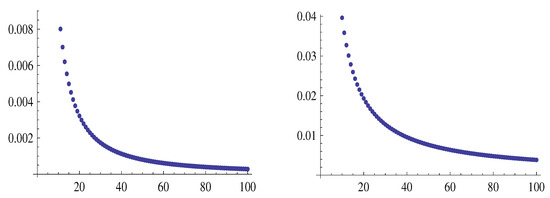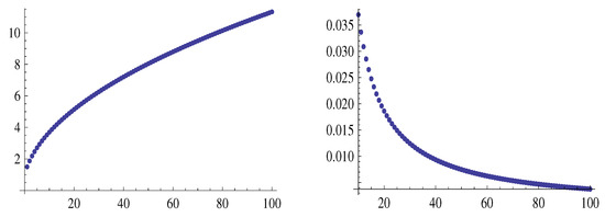 Figure 9 shows the graphs of the sequences and , left and right, respectively.