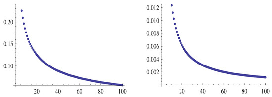 Figure 8 shows the graphs of the sequences and , left and right, respectively.