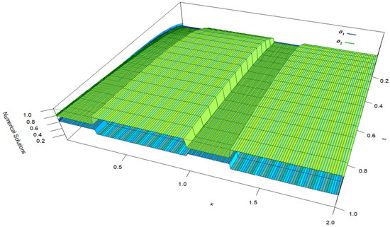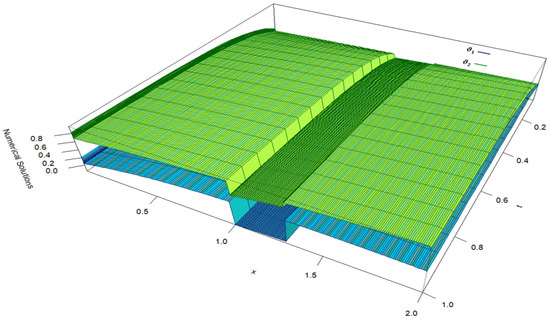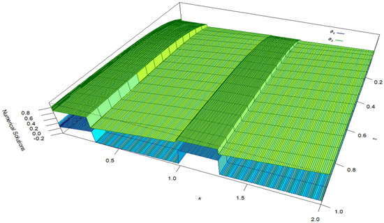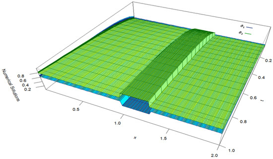 The perturbation parameters are expressed in terms of as and , with taking different values as outlined in Table 1, Table 2, Table 3 and Table 4. The values and are calculated using the procedure outlined above, and the results are presented in Table 1 for Case 1 and Table 3 for Case 2. The values and are obtained from Table 1 for Case 1 and the values and are obtained from Table 3 for Case 2. From both tables, it is evident that, as N increases, the values of increase, whereas the values of decrease. The computation times in seconds for obtaining the maximum point-wise errors for Case 1 are presented in Table 2, while those for Case 2 are provided in Table 4. Figure 1 represents the solutions of Case 1 of Example 1 for , and . The solutions and exhibit rapid transitions in the initial and interior regions of the domain due to the influence of perturbation parameters, discontinuous source terms, and delay terms. The solution components and form initial layers at near boundary region of the domain, while the interior layers emerge at due to the delay terms, as well as at and as a result of discontinuities in the source terms. Figure 2 represents the solutions of Case 2 of Example 1 for , and . The solution components and form initial layers at near boundary region of the domain, while interior layers emerge at due to the delay terms, and at as a result of discontinuities in the source terms.