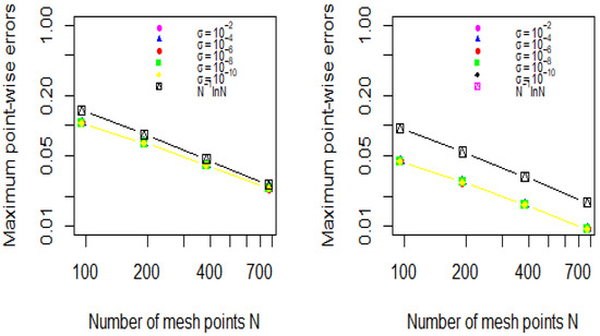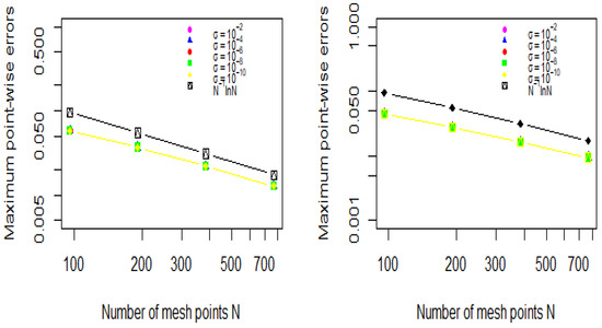 The perturbation parameters are expressed in terms of as and , with taking different values as outlined in Table 5, Table 6, Table 7 and Table 8. The values and are calculated using the procedure outlined above, and the results are presented in Table 5 for Case 1 and Table 7 for Case 2. The values and are obtained from Table 5 for Case 1 and the values and are obtained from Table 7 for Case 2. From both tables, it is evident that, as N increases, the values of increase, whereas the values of decrease. The computation times in seconds for obtaining the maximum point-wise errors for Case 1 are presented in Table 6, while those for Case 2 are provided in Table 8. Figure 3 represents the solutions of Case 1 of Example 2 for , and . The solutions and exhibit rapid transitions in the initial and interior regions of the domain due to the influence of perturbation parameters, discontinuous source terms, and delay terms. The solution components and form initial layers at near the boundary region of the domain, while the interior layers emerge at due to the delay terms, as well as at and as a result of discontinuities in the source terms. Figure 4 represents the solutions of Case 2 of Example 2 for , and . The solution components and form initial layers at near the boundary region of the domain, while the interior layers emerge at due to the delay terms, and at as a result of discontinuities in the source terms. Figure 5 and Figure 6 present log-log plots of the maximum point-wise errors for Example 1 (Case 1 and Case 2) from Table 1 and Table 3, and for Example 2 (Case 1 and Case 2) from Table 5 and Table 7, respectively.