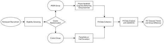 This preliminary study analyzes time-series data collected during an ongoing parallel, two-arm clustered randomized controlled trial, “Optimizing a technology-based body and mind intervention to prevent falls and reduce health disparities in low-income populations”, with the primary aim of examining differences in fall risk and PA following completion of the PEER compared to the control group among community-dwelling older adults [19].