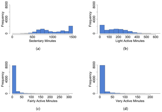 Marginal distribution (histogram) of 4 PA minutes categories. (a) Sedentary minutes; (b) light active minutes; (c) fairly active minutes; (d) very active minutes.