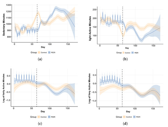 SSANOVA model prediction of daily PA by PA levels and participant groups. Blue: PEER group. Orange: control group. Light shaded area: confidence interval. Black dotted line: intervention program completion and the beginning of the follow-up period. The spikes in PEER group are the group workout days in the PEER intervention program. (a) Sedentary minutes; (b) light active minutes; (c) fairly active minutes; (d) very active minutes.