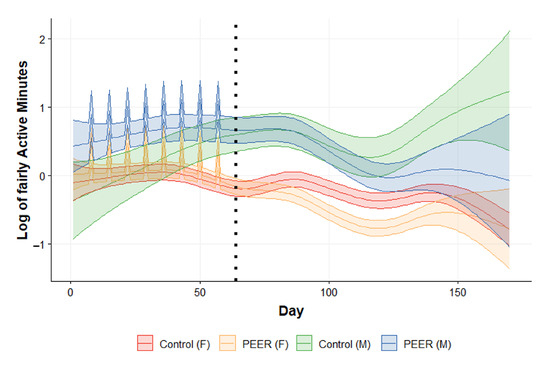 SSANOVA model prediction of log of daily very active minutes by participant group and gender. Blue: PEER male. Orange: PEER female. Green: control male. Red: control female. Light shaded area: confidence interval. Black dotted line: intervention program completion and the beginning of the follow-up period. The spikes in PEER groups are group workout days in the PEER intervention program.