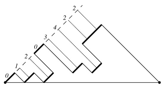 we obtain a bijection P between permutations of length n and underdiagonal paths of size n. So, given , and the inversion sequence corresponding to , is the unique underdiagonal path of size n with up steps , where the distance of from the diagonal is given by . On the other side, given an underdiagonal path P of size n, we define as the permutation of length n such that (see Figure 2).