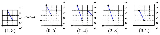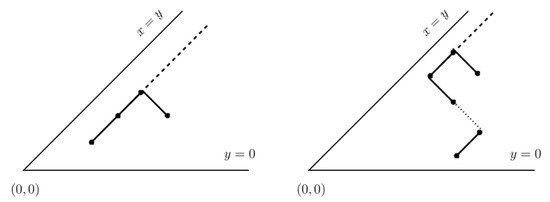 Strong -constrained paths are underdiagonal paths with a strong constraint set for any . Precisely, a strong -constrained path P is a path such that, for every factor of P, , , the suffix of P to the right of the factor lies strictly below the line parallel to , and passing from , i.e., the edge line of P supporting (see Figure 11).
