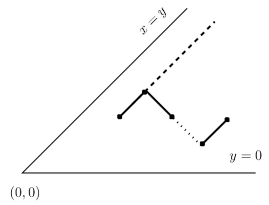 An underdiagonal path P is -avoiding if, for every factor , the first U step lies on the diagonal (see Figure 4).