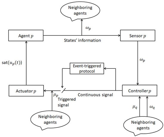 where denotes the controller gain, and represent the communication strengths within the MAS as defined in (1), and refers to the rth trigger time for agent p. The DATEM is expressed as follows: