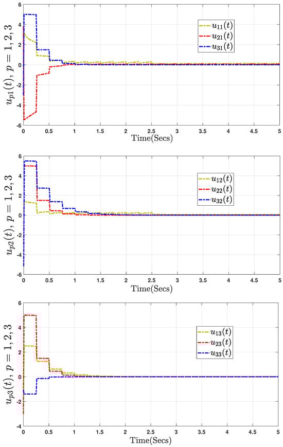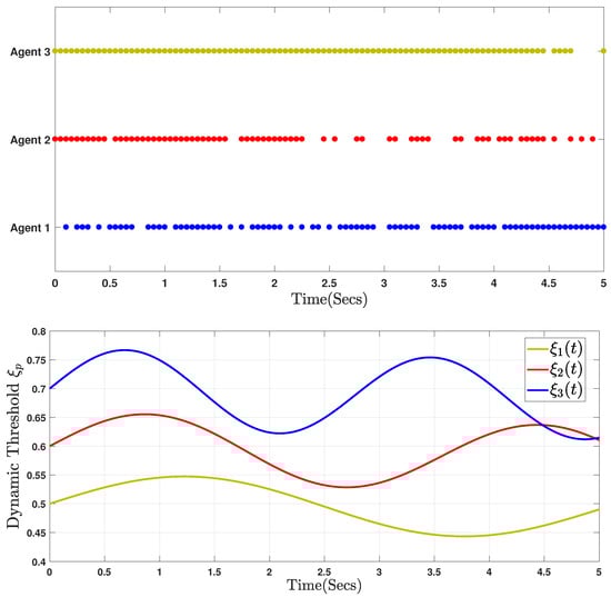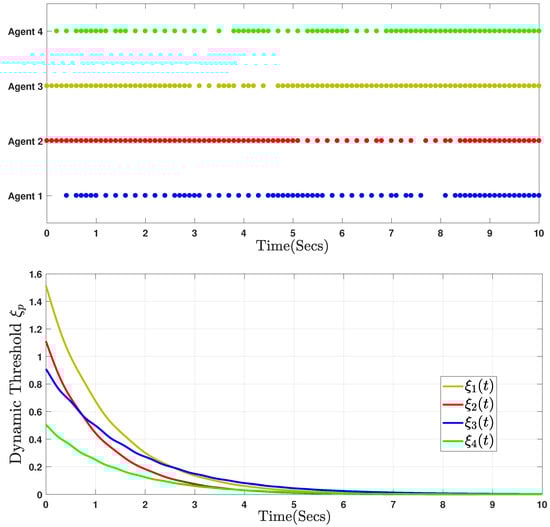 The initial state values of the system are and . Specifically, Figure 10 displays the state trajectories of fractional-order Chua’s system (40) without control input. The trajectories of the state errors are shown in Figure 11, Figure 12 and Figure 13. We propose the DAETM scheme (4) for each follower in the fractional-order Chua’s system (40), which consists of one leader and three followers. Figure 11 shows the responses of the tracking variables for the leader and the three followers using the DAETM scheme (4). Figure 12 shows the evolution of the control input for the three followers. Figure 13 illustrates the time points of the event triggering and the adaptive parameters Based on the analysis in Figure 11, Figure 12 and Figure 13, the dynamic variables used in the DAETM scheme demonstrate that the number of events triggered by the DAETM (4) with actuator saturation is significantly lower compared to the fixed-variable ET mechanism proposed in our study. This reduction in triggered events highlights the efficiency of the DAETM scheme in minimizing communication while maintaining synchronization among the agents. Moreover, by comparing the proposed DAETC mechanism in (4) with those in [,,], which exhibit similar consensus performance, we conclude from Figure 13 and Table 5 that adopting the mechanism in (4) significantly reduces the communication burden. This reduction highlights the critical importance of selecting appropriate ET mechanism parameters to enhance the use of communication network bandwidth. In contrast to existing studies [,,], our analysis demonstrates that the proposed strategy not only reduces data transmission but also improves overall system performance by increasing resource utilization and minimizing unnecessary communication. These results suggest that careful design of ET mechanisms can substantially enhance the efficiency of distributed systems.