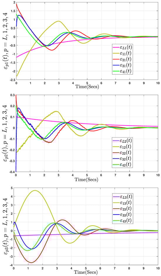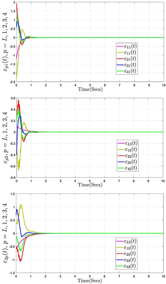 Therefore, implying that the consensus of the leader–follower FONMANSs is achieved. This ensures that all agents converge to a common state, satisfying the consensus of the system condition. □