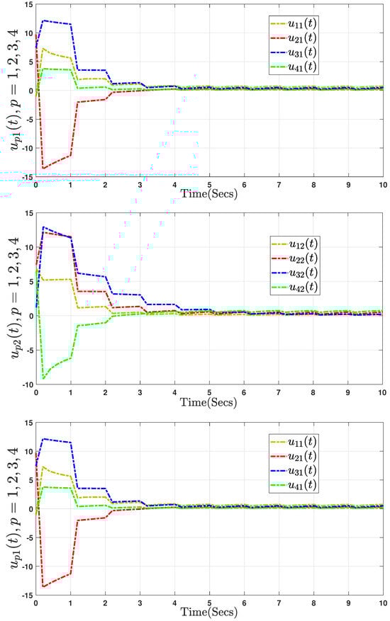 where In addition, , , and are defined as follows: We then select the following model parameters: and which follows a structure similar to that in []. It is established in [] that satisfies Assumption 2. We assume that Chua’s circuit systems are applied with these model parameters to guarantee the stability of the FONMAS given in (40). The proposed values are , , , and Finally, using Theorem 1 and solving LMIs (9) and (10), it is observed that