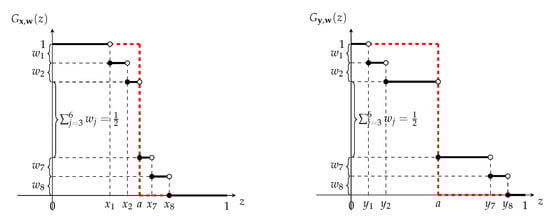 In this section, we demonstrate the properties of the weighted consensus measures and given by Equations (30) and (32), respectively. Recall that these two measures are induced by the fuzzy entropies and given in Equations (29) and (31), respectively. We utilize nine different input vectors (the components of which are denoted by ) and the weight vector (the components of which are denoted by ), as shown in Table 2.