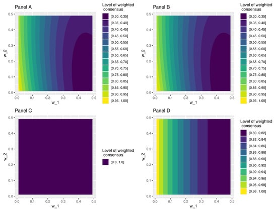 In Panel A of Figure 4, we see that the level of weighted consensus depends on the weight vector to a large extent. Here, the third and fourth decision-makers agree with one another as , while the first and second decision-makers, especially the first one, have different opinions . We also see that if the first decision-maker has a high weight value, then the level of weighted consensus is relatively low. As the opinion of this decision-maker is very different from those of the others, their weight has a big influence on the level of weighted consensus. At the same time, the weight value of the second decision-maker does not really have a high influence, which is reflected in the contour map as moving vertically and does not really alter the color and hence the level of weighted consensus.