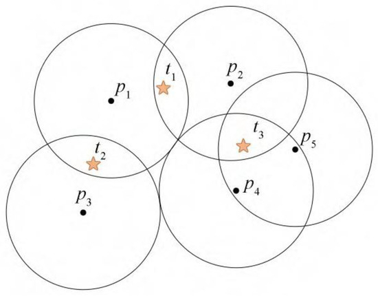 We randomly deployed n sensor nodes to cover m static targets in a two-dimensional space of X × Y. The set of sensor nodes is P = {p1, p2, …, pn}, and T = {t1, t2, …, tm } is the set of targets. In this paper, it is assumed that the sensor nodes in the network have the same coverage capability and initial energy, and the nodes’ locations do not change after deployment. Figure 3 shows a network of five sensor nodes (represented by the black dot) and three targets (represented by the star symbol).