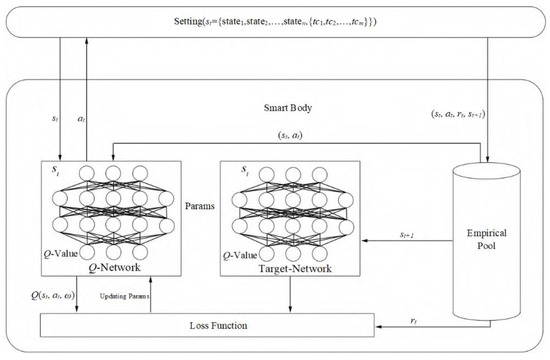 Initially, Q-learning appeared based on tables for environments with low dimensionality. Reference [18] proposed Deep Q-network (DQN) to estimate the optimal action-value function in complex environments using a neural network Q (st, at; ω), where ω denotes the parameters of the neural network, rt after a smart body performs an action, is a deterministic value, so is used as the training target of DQN. DQN is trained using the temporal difference (TD) algorithm [19] with the following loss function.