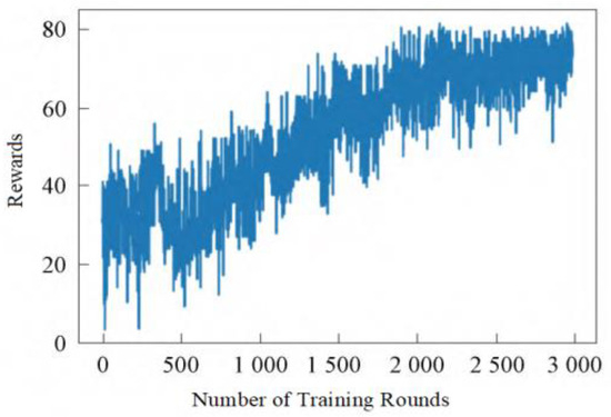 As shown in Figure 5, 10 targets are randomly deployed in a WSN consisting of 50 sensors with a sensing radius of 40 m. The experiment recorded the cumulative gains of the smart body in 3000 rounds of training. In Figure 5, the smart body selects actions blindly at the beginning of training, and selects more redundant sensors, activated sensors and dead sensors. As the number of training rounds increases, the smart body gradually learns the strategy of obtaining more single-step rewards, and the cumulative rewards gradually increase. After 2500 rounds of training, the cumulative gains obtained by the smart body in each round of training are gradually smooth, and the algorithm tends to converge.