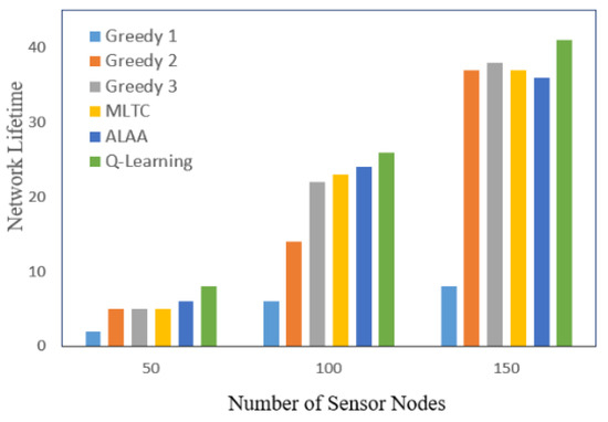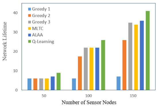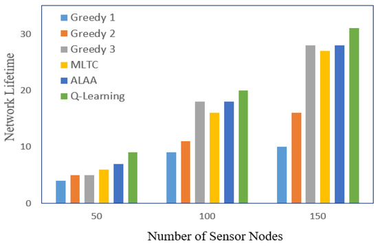 The network is randomly deployed with 10, 20 and 30 targets and 50, 100 and 150 sensor nodes with a sensing radius of 40 m. Using the Deep Q-learning algorithm proposed in this paper, three greedy policy algorithms (Greedy 1 adopts the policy of selecting the sensor node with the highest number of covered targets at a time, Greedy 2 adopts the policy of selecting the sensor node with the highest residual energy and Greedy 3 adopts the policy of selecting the sensor node that covers the most number of uncovered targets), the Maximum Life-cycle Target Coverage Algorithm (MLTC) [22] and the Adaptive Learning Automata Algorithm (ALAA) [14] were used to calculate the network lifecycle, respectively, and the results are shown in Figure 6, Figure 7 and Figure 8. It can be seen that for Greedy 1 and Greedy 2 algorithms, in the case of a small number of sensor nodes, the difference between the network lifetime and the other algorithms is very small, when the number of sensors increases, the coverage of the situation is complex, the two algorithms are not good. In Greedy 3, the MLTC and ALAA algorithms have better results, but the stability of the different network environments needs to be improved. Q-learning has better results than several other algorithms and achieves a longer lifetime. Meanwhile, the results show that the lifetime is positively correlated with the number of sensor nodes.