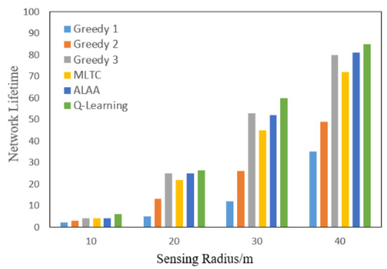 In total, 100 sensor nodes and 40 targets are randomly deployed in the network, and the sensing radius of the sensors are 10, 20, 30 and 40 m. The lifetime is calculated using each of the above algorithms, and the results are shown in Figure 9. It can be seen that when the sensing radius is 10 m, the number of targets covered by each sensor in the network are small, and the lifetime calculated by each algorithm is approximate. With the increase in the sensing radius, the number of targets covered by each sensor increases, and each target can be covered by more sensors. Therefore, although there are differences in the lifetime calculated by the algorithms, they all show that the network lifetime is positively correlated with the sensing radius of sensors.