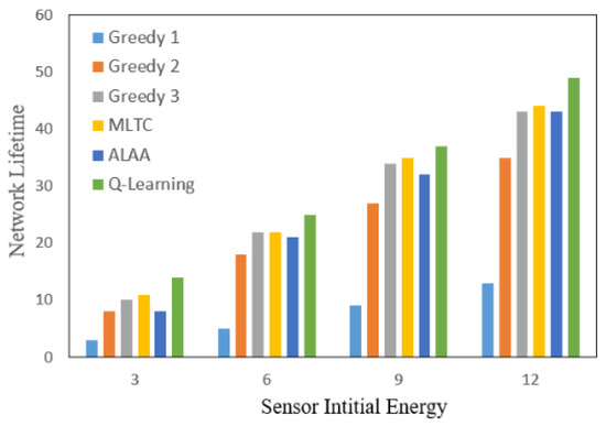 The network is deployed with 100 sensor nodes, and 20 targets at the same time. The sensor sensing radius is fixed at 30 m, and the initial energy carried by the sensors is increased step by step from 3 units to 12 units, and the results of the experiments are shown in Figure 10. It can be seen that when the sensor carries less energy, the lifetime of each algorithm is shorter. With the increase in carrying energy, the lifetime of each algorithm is extended. Therefore, the experiments show that the lifetime is positively correlated with the initial energy of sensor.