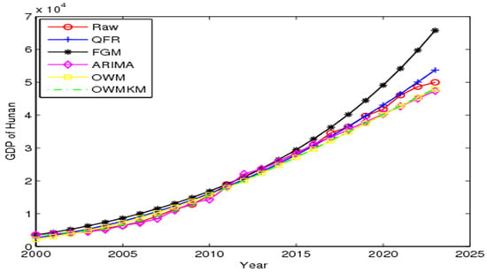 In the same way as in Part 3, the QFRMKM model, FGMKM model, and MKMOWM model are established to predict Hunan’s GDP of China. The Markov optimal weighted combination model is