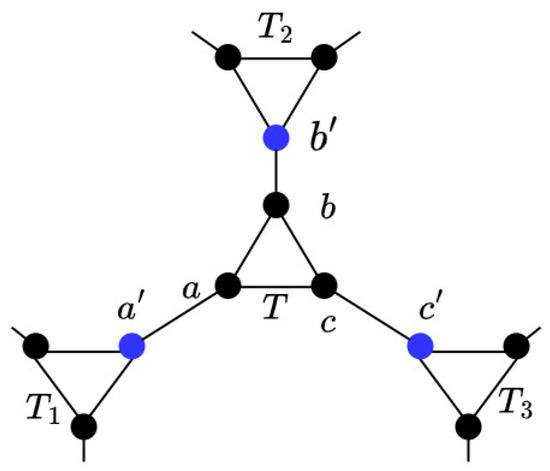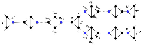 Let T be any triangle unit of G with . By definition of the pseudo path, , , and are the external endvertices of the pseudo paths , , and , respectively. Assume that , , and belong to the triangles , , and , respectively. Let be the neighbor of a not in T, the neighbor of b not in T, and the neighbor of c not in T.