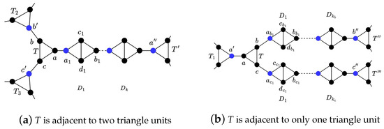 On one side, without loss of generality, assume that belongs to a diamond unit, and and belong to two different triangle units and , illustrated in Figure 3a. By the definition of the pseudo path, we can assume that the diamond unit in pseudo path is () with , where and , the edges connecting two adjacent diamond units and .