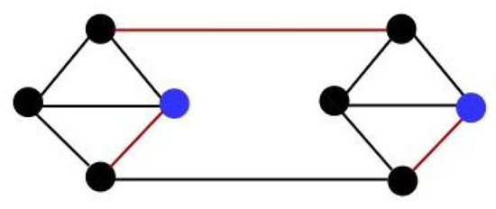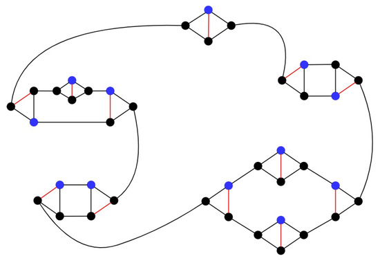 Now, we construct a new subset S of by collecting (1) edge in each A-unit ; (2) edges and in each B-unit ; (3) edges , , and in each C-unit ; and (4) edges , , , and in each D-unit . Then, . Combining Observations 2 and 3, S is an edge dominating set of G. That is, . According to Theorem 2, we know that if , then . □