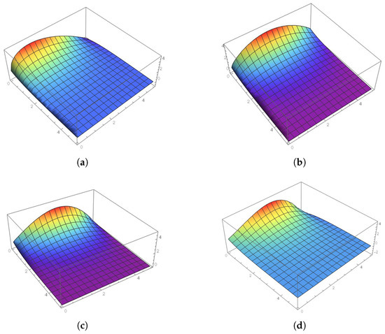 The surface plots of the approximate solution of Case I for = (a) 0.4, (b) 0.6, (c) 0.8, and (d) , respectively.