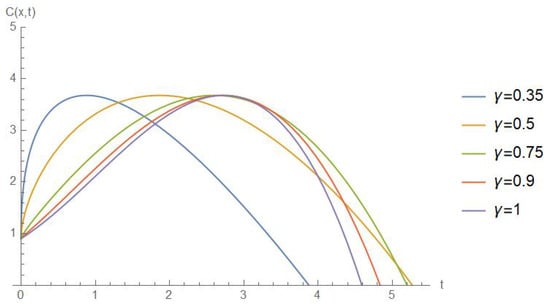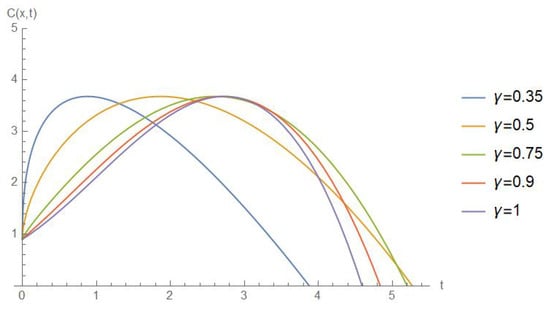 The time-dependent evolution of the cancer cell concentration for various values of the fractional order is depicted in a 2D format in Figure 2. These results clearly illustrate the effect of fractional order variations on the spatial distribution and temporal behavior of cancer cell concentrations. As changes, the concentration profile evolves differently, highlighting the critical role of the fractional order in modulating the spread and concentration of cancer cells over time.