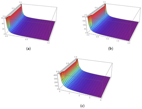 The surface plots of the approximate solution of Case II for (a) , and (c) , respectively.