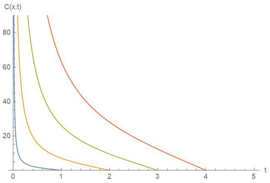 The temporal variations in cancer cell concentration for different fractional order values are shown in a 3D and 2D format in Figure 5 and Figure 6 respectively. These results provide valuable insights into how the fractional order affects the dynamic behavior of cancer cell concentration over time. The influence of the conformable fractional derivative becomes remarkable on the dynamics of the system, with the concentration profiles exhibiting distinct patterns depending on the value of , where smaller values of lead to more gradual variations in concentration, while larger values of result in sharper transitions and more pronounced changes in the concentration distribution over time. This case underscores the importance of the fractional order in shaping the system’s evolution and offers a deeper understanding of its role in the dynamics of cancer cell spread.